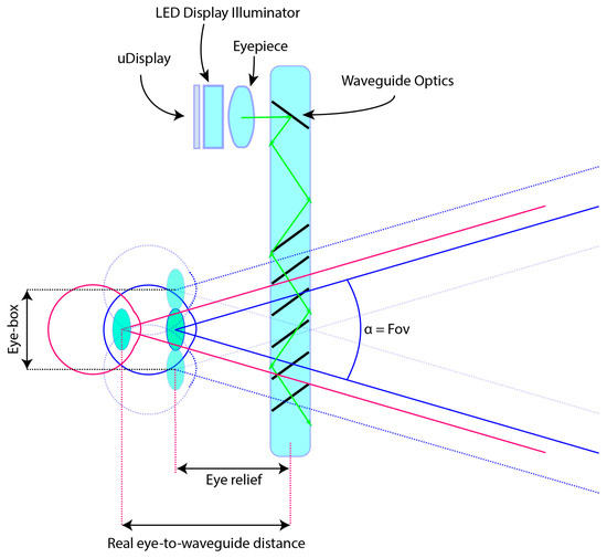 Another important aspect to consider is the actual position of the nodal point of the user’s eye () with respect to the DRS. This brings about changes in the variables plugged in Equation (3): in the previous equations, we assumed that the nodal point of the eye (eye centre) was located exactly at the vertex of the display frustum (i.e., or ). Unfortunately, this is hardly the case in reality. In addition, we must consider the optical properties of the display eyepiece (i.e., eye relief, eye-box, virtual or focal plane position) (Figure 3). These properties play a role in the way in first approximation the non-ideal eye placement in the display reference system ( affects the elements of .