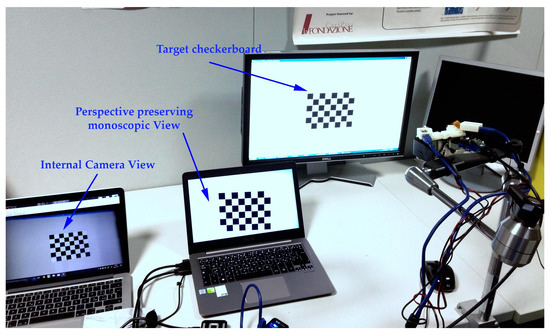 For measuring the patterns of monoscopic disparities between direct view and VST view, we used the experimental setup showed on Figure 4. The on-image displacements between real features and HMD-mediated ones were measured by means of an additional video camera (Sony FCB-MA13) placed approximately at the ideal eye’s position (internal camera). As target scene, we used a standard checkerboard of size 160 × 120 mm (with square size 20 mm) that was displayed on an external monitor. The internal camera was able to capture two views of the target scene: a direct view and a VST view (Figure 5). The corners of the checkerboard could be robustly detected through a Matlab’s function for corners detection. The on-image displacements or monoscopic disparities between the image coordinates of the real and VST views of the corner points were so easily determined. The real poses of the target planes with respect to the internal camera were estimated by solving a standard perspective-n-point problem and knowing the 3D-2D point correspondences.