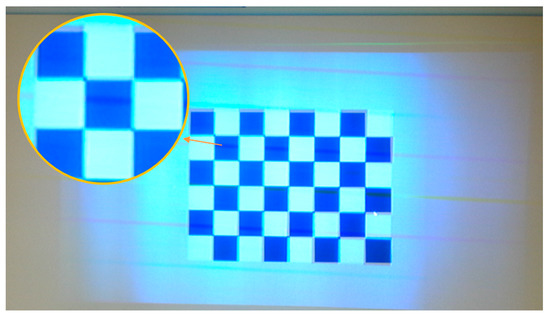 Since our HMD did not comprise any eye-tracker to calibrate the stereo cameras to the user’s inter-pupillary distance and since we did not perform any specific display calibration (for precisely determining), in our tests we determined an approximation of the homography as follows. We asked the user to wear the HMD and observe under OST modality a target checkerboard placed orthogonally to his own viewpoint at approximately the distance of the homography plane (Figure 4). We then performed, in real time, multiple refinements of the initial homography by means of an additional translational homography () whose role was to align the user’s views of the checkerboard (real and synthetic). With this additional homography we intended to compensate for the uncertainties in defining the actual position of the eye E with respect to D. In our method, we only considered the effect of translational movements along the x and y-axis (parallel to the image plane). Thus, to a first approximation, we excluded the effect of a non-perfect placement of the user’s eye centres at the eye-relief (i.e., we assumed: eye relief = real eye-to-waveguide distance). The relation between the approximated homography and the ideal then becomes: