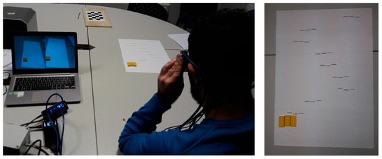 The paper sheets were placed at five different distances from the observer (Figure 6), covering a range of depths of about 900 mm (i.e., from a minimum absolute depth of 300 mm to a maximum depth of 1200 mm). For each position of the paper sheet, the test was repeated four times.