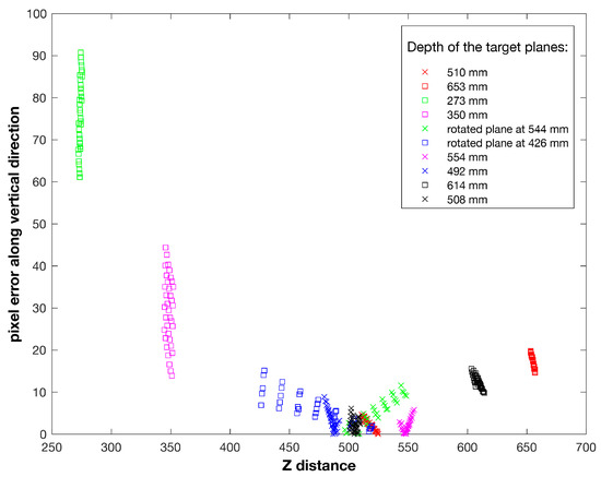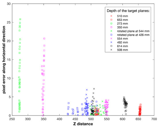 In relation to the distance from the reference plane, the vertical disparities follow a steeper increase with respect to the horizontal disparities. This fact directly results from the vertical parallax between CRS and DRS, while the horizontal disparities are only functions of the distance from the reference plane. In Figure 9, we show the horizontal disparities for the points belonging to the six target planes closer to the reference plane. Here the range of depths is: (479–555) mm. In Table 1 the values of the mean and standard deviation of the horizontal disparities are reported for all the target positions.