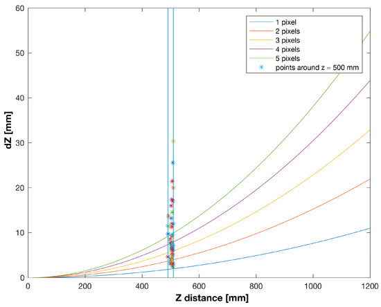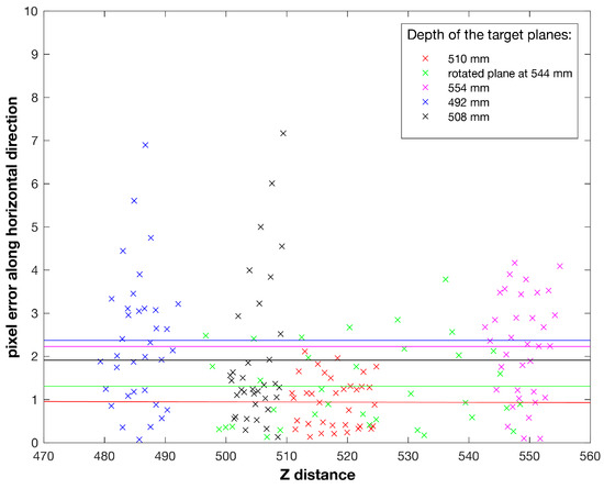 Horizontal monoscopic disparities for the target planes around z = 500 mm. The coloured lines are the mean pixel errors on the u coordinate for each target plane.