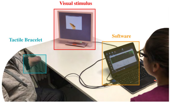 Two similar experiments were performed: the first involved the able-bodied subjects, whereas the second involved the amputated subject. The same experimental setup, described in detail in the following sections, was used for both experiments (see Figure 1). The setup was intentionally maintained as simple as possible, and in the end, it only consisted of the aforementioned tactile bracelet and of a monitor on which a visual stimulus was displayed.