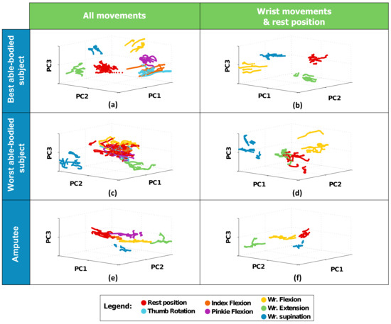For comparison, graphs in the first column (Figure 5a,c,e) show the full set of movements, while those in the second column (Figure 5b,d,f) show only the wrist movements. Figure 5a,b show data gathered from the able-bodied subject with the most separable classes (Fisher’s separateness index); Figure 5c,d show those obtained from the able-bodied subject least separable classes; and Figure 5e,f show those obtained from the amputee during the third trial.