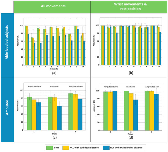 Similarly to the results obtained from the able-bodied subjects, the classification of the wrist movements was more accurate (Figure 6d). In this case, the NCC with Mahalanobis distance performed better in the first trial, but worse than the other classifiers considered in Trials 2 and 3. The mean accuracy results of the k-NN for the intact arm in Trial 2 were 100% and 99.18% for the amputated arm in Trial 3. For this experiment, no statistical analysis was performed as we only collected data from one amputee.