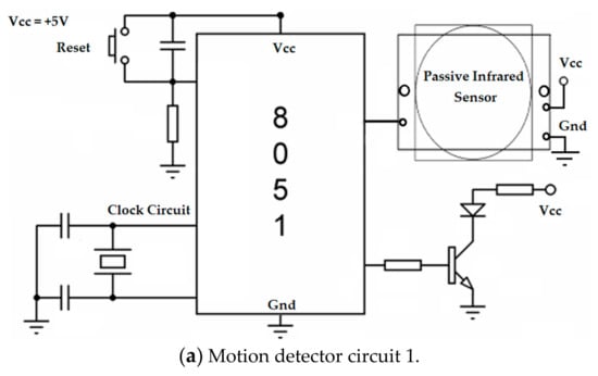 An example of an MD system using only salvaged components is shown in Figure 1b. The MD sensor detects the displacements of the objects, and gives the proper output consistent with the circuit [13]. This simple circuit uses an IR node to send an IR beam and photo transistor for reception of this IR signal (Figure 1b). Any interference or disturbance in the middle of the transmitting and the receiving parts of the system, means an intrusion, and sets the alarm on. This is low-cost circuit is an easy to build motion detector. The IR node will produce the high-frequency beam, which reaches the photo transistor with the help of 555 timer at the transmitter. When this high-frequency beam is disturbed, the photo transistor will trigger the 555 receiver timer to give an alert. Without motion, there will be no output (alarm).