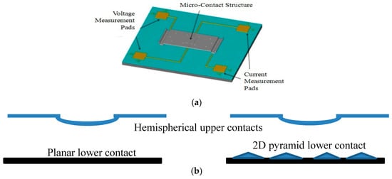 In addition, it has also been reported that the effective conduction area between the top and bottom contact depends on surface contamination which can affect the contact resistance (RC) of micro-contacts []. This suggests that micro-contacts with different surface features might behave differently and can also offer a solution to premature device failure. In fact, we have reported that the RC of hemispherical-2D pyramid micro-contacts is much more stable than that of hemispherical-planar micro-contacts (where RC increases with # of cycles) []. However, the effect of external loading on the performance of hemispherical-2D pyramid micro-contacts under AC conditions has not been reported. Therefore, a brief discussion on this concern is also addressed in this paper.