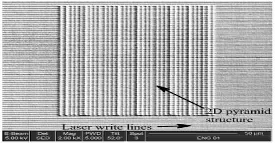 In this work, a Heidelberg µPG-101 system was used to fabricate the 2D pyramid structures used on the bottom contact pads. This system can be operated in two modes: (a) image and (b) line scan. However, both modes have their own limitations, for example, image mode can perform grayscale lithography but offers poor precision. On the other hand, line scan mode offers much higher precision but uses a single power and duty cycle, offering only one level of traditional-type exposure. Therefore, a unique hybrid technique was developed by combining both modes to fabricate 3D structures with higher precision. In this approach, multiple CAD (computer-aided design) designs were superimposed on each other and exposed to low dose UV radiation (in repeated fashion) to achieve the same effect as the bitmap approach, but with much better resolution. Here, only specific information related to 2D pyramid fabrication is given whereas the detailed and more general information about hybrid gray-scale lithography can be found in our previous work []. Two different methods were used to fabricate the 2D structures. The first was an image representing the entire die which consisted of 16 beams, and therefore, 16 lower contacts in a 5000 µm × 5000 µm area. This image was scaled to the correct overall size. The second method used the manual alignment of the Heidelberg system to direct where these blocks should be located. This method was more tedious but with the addition of a few alignment marks on the wafer, allowed the precise alignment of the lower contact. A scanning electron microscope image of the final 2D pyramids is shown in Figure 3.