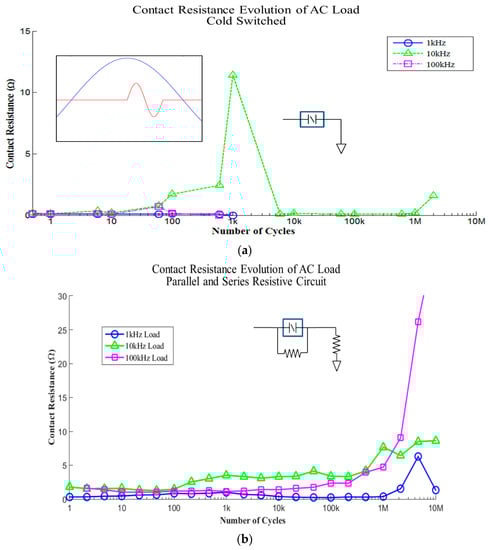 Figure 4a shows the experimental results of three devices which were tested under cold switch conditions without an external load. These three devices were characterized at three different frequencies and they all failed well before the 10 million cycle goal. The device tested with a 10 kHz signal experienced failure after 2.3 million cycles. On the other hand, the remaining two devices which were tested with 1 kHz and 100 kHz signals both failed before 103 cycles, as shown in Figure 4a. For all three devices, the AC load was comprised of a single cycle applied during the fully closed period of the micro-contact mechanical actuation cycle. In the case of the 1 kHz load, the overall cycle time, at which the contact itself was cycled was limited to 200 Hz, maintained cold-switched conditions. For the 10 kHz load, the testing time was increased to 1 kHz, and for the 100 kHz load, the cycle time was the full 2.5 kHz. These conditions were repeated for all experimental data presented here, but with the addition of external circuit components described in the following sections.