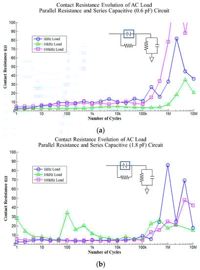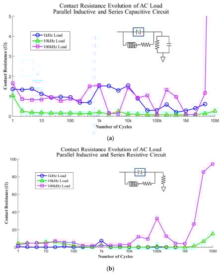 The second loading configuration is shown in Figure 5a. Here, the same resistances were used as in the previous test, but in addition, the parallel resistance had a series inductance added (0.1 µH), and the series resistance was placed in parallel with an additional capacitor (0.6 pF). All other test conditions remained the same as in the previous test. When comparing these results to the previous tests, it is important to note the scale on the plot. While the variability was more erratic than the previous tests, this variance was less than ~2 Ωs throughout the duration of the tests. This circuit configuration resulted in one failed device, which occurred during the 1 kHz AC load test. This failure occurred after ~4.9 million cycles, at which point, the contact failed to open (i.e., shorted). This set of data also includes the most stable result observed from all tests conducted. This occurred with the 10 kHz test, which settled after just a few cycles of operation and remained at roughly 0.25 Ω, even after up to 10 million cycles.
