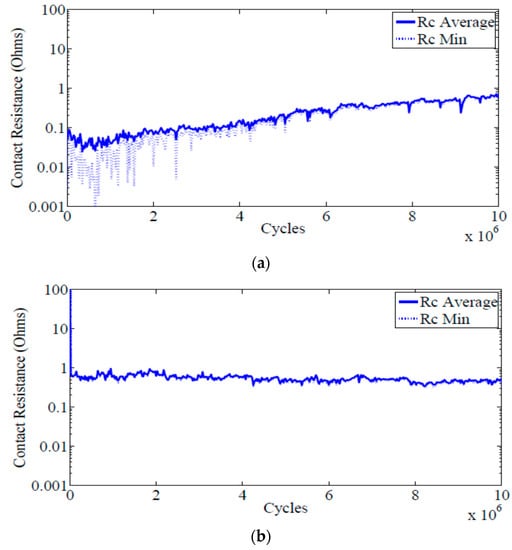 The 107 cycle experiments of all Au–Au micro-contacts were conducted in the same test stand, as shown in Figure 1. The RC plot of the hemispherical-planar micro-contact is shown in Figure 7a.