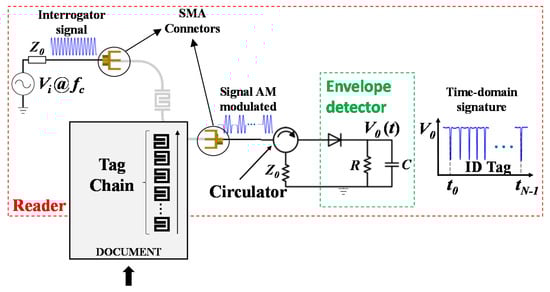 The operating principle of the time-domain chipless-RFID system, which is based on near-field and sequential bit reading was first reported in Herrojo et al. [50] and is succinctly reviewed in this paper for coherence and completeness. The tag consists of a linear chain of resonant elements (all identical) printed or etched at predefined and equidistant positions on a dielectric substrate (typically a flexible substrate, such as plastic, paper, etc.). The ID code is given by the functionality or non-functionality of the resonant elements, in which a resonator is not functional if it is detuned, namely, not resonating at its fundamental resonance frequency. Resonator detuning may be achieved, e.g., by cutting it. For tag reading, an element able to detect the functionality of the resonant elements is required. For such purposes, a transmission line, which is conveniently fed by a single tone signal tuned to the resonance frequency of the tag resonators or close to it, is adequate. Thus, by displacing the tag chain over the fed line, a coupling between the line and the resonant elements is expected (as long as the resonant elements are functional and the distance between the line and the resonant elements is small). Each time a functional resonator lies on top of the line, the coupling prevents the signal from transmitting through the line. The effect is a variation of the transmission coefficient at the feeding frequency due to near-field coupling; consequently, the output signal is amplitude modulated. Hence, the ID code is contained in the envelope function of the amplitude modulated (AM) signal, which can be inferred by means of an envelope detector, a simple circuit able to provide the envelope function where the ID code is contained. Indeed, the ID code is provided in time-domain, where the logic state ‘1’ is given by the dips in the time response of the envelope function. The working principle of this unconventional time-domain chipless-RFID system is illustrated in Figure 1. When compared to frequency-domain chipless-RFID systems, the time-domain approach illustrated in Figure 1 exhibits a significant advantage: the interrogation signal is a harmonic (single tone) signal. Thus, the cost of the reader can be significantly reduced because a multi-frequency sweeping signal is not required. Indeed, the spectral bandwidth of the proposed tags is virtually null because all the resonant elements of the tag are identical (i.e., tuned to the same frequency). The difference between these tags and spectral signature barcodes is that the reading is based on frequency division multiplexing in spectral signature barcodes. In contrast, in the novel chipless-RFID systems proposed by us, time division multiplexing is used for tag reading.