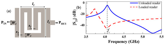 Layout of the SRR-loaded microstrip line of the reader (a), and transmission coefficients with and without oppositely oriented SRR on top of it (b). Dimensions are (in mm): l1 = 3.16, l2 = 3.35, s1 = 0.2, s2 = 0.2, W1 = 0.56, and W2 = 0.5. The considered air gap is 0.25 mm. The substrate of the line is the Rogers RO3010 with thickness h = 0.635 mm and dielectric constant εr = 10.2. The substrate of the tag is the Rogers RO4003C with thickness h = 0.204 mm and dielectric constant εr = 3.55. Figure extracted from Herrojo et al. [55]; printed with permission.