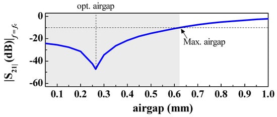 Transmission coefficient at fc for different values of the air gap, corresponding to the reader loaded with perfectly aligned SRR. Figure extracted from Herrojo et al. [54]; printed with permission.