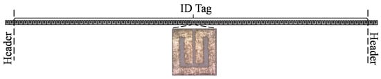 As previously mentioned, the tags consist of a linear chain of SRRs, which is identical to the one of the reader line. To demonstrate the viability of the system with very low-cost tags, we opted to use ordinary DIN A4 paper as tag substrate, with measured dielectric constant and loss tangent of εr = 3.11 and tanδ = 0.036, respectively. Such measurements were carried out by means of the resonant cavity 85072A. Clearly, the response of the SRR-loaded line of the reader, which, in turn, was loaded with the tag, depended on the tag substrate, but this dependence was relatively soft as long as tag substrates with similar thickness and dielectric constant were considered. Note also that the dielectric constant value of the substrate of the reader line was not related to the substrate of the tag. Such value (the dielectric constant of the reader substrate) was chosen relatively high to reduce the size of the resonant element of the reader and, consequently, the resonant elements of the tag (provided they are identical). Moreover, we implemented the tags by inkjet-printing using DupontTM PE410 conductive ink, with a measured conductivity of 7.28 × 106 S/m. One layer (with measured thickness of 2.6 μm) suffices, thereby optimizing tag cost. The number of resonant elements was set to 80 for the ID code (corresponding to 80-bit tags), plus four SRRs for the header bits. Such header bits were needed because the tag could be displaced over the reader starting from the two extremes (corresponding to tag SRRs either face up or down). The photograph of the fabricated tag with all ID bits set to the logic state ‘1’ (i.e., with all resonators functional) is depicted in Figure 5. The total length and width of the tag (including the header bits) was 267.2 mm and 3.35 mm, respectively. With this size, the tag could be accommodated along the longitudinal side of DIN A4 paper. For security and authentication of this type of document, the limit was 88 bits (plus the header bits) because this is the number of bits achievable along the longer side of DIN A4, taking into account that the tag period was 3.36 mm.