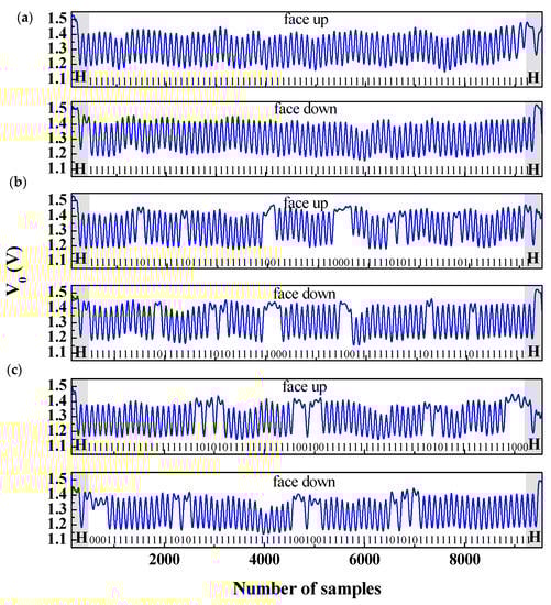 Measured envelope functions of the inkjet-printed 80-bit tag with the indicated codes. Because the envelope function has been inferred from a data acquisition system, the abscise axis is the number of samples. Note that there is no difference in the reading results between face-up and face-down tags. The codes are read in opposite directions for face-up or face-down tags, but this is indicated by the header bits and, therefore, there is no confusion regarding this aspect. (a) code with all bits set to ‘1’ logic state, (b) programmed tag and (c) reprogrammed tag.