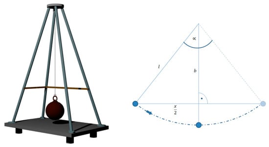 For reliable simulation of a one-dimensional, time-constant reference movement, a mechanical pendulum was used (see Koltermann et al. []). This apparatus (see Figure 1, left) generates a dynamic, reproducible CoP track over the time used for the analysis. The pendulum was designed in the form of a four-legged tripod with a lead ball of 25 kg fastened to the pendulum with a steel cable. Since the mass of the cable was negligible compared to that of the weight, it was excluded from further analysis. The reference values for the determination of measurement accuracy could hence, be determined using the length of the pendulum, the initial angle of release, and the sampling time, in accordance with Figure 1 (see []). In this study, the pendulum had a length of 97 cm.