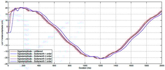 In Figure 2, a noticeable discrepancy between the original, unfiltered trajectory and the processed signal trajectories can be identified, and the difference is greatest within the first 50 ms. This “loading time” is typically observed with mathematical filters and furthermore, it is apparent that with increasing order, a larger phase shift is produced in comparison to the original signal.