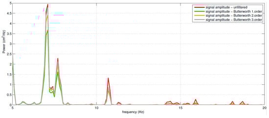 Figure 3 illustrates the strength of the signal dependency on the cutoff frequency (13 Hz) of the Butterworth filter. From this graph, it can be clearly seen that the filters, and in particular their orders, not only affect frequencies above the cutoff frequencies, but also frequencies below, and the peak at 7 Hz demonstrates this strikingly. With increasing order of the filters, however, this effect decreases.