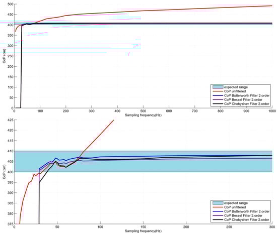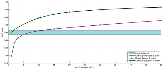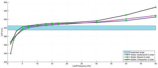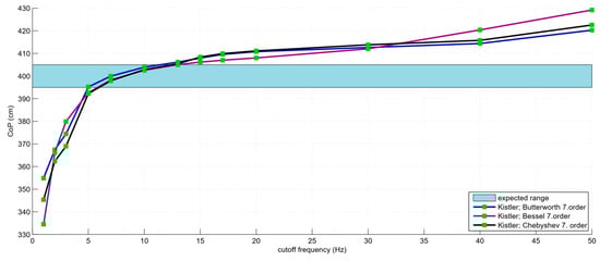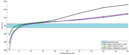 Above a cutoff frequency of 24 Hz, the filter results are near the expected value, whereby an abrupt increase can be observed (see Figure 8). With increasing sampling rates within the range from 25 Hz to 78 Hz, the CoP trajectories filtered with the Butterworth and Bessel filters follow the path of the unfiltered signal. In contrast, at a frequency of up to 50 Hz, the results of the Chebyshev filter demonstrate larger deviations from the original path. Above 50 Hz, the Bessel and Butterworth filters show a largely constant tendency within the expected range, but for the Chebyshev filter, this is only the case above 78 Hz.