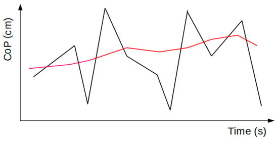 When measuring a CoP track, significant differences in length can develop over time. In Figure 9, this difference in length is schematically represented by a signal with a murmur and its filtered equivalent. Although the data points have the same values on the time axis, the movement of the CoP is notably dissimilar. This becomes clearer when imagining the signal paths as stretched out lines, where the filtered signal (red line) would be significantly shorter than the murmur (black line).
