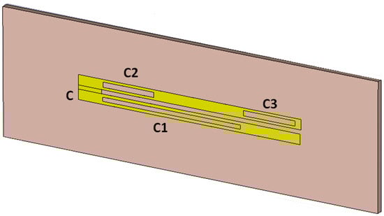 Although a single C-scatterer can encode information in different forms such as in resonance (or anti-resonance) or in phase, the C-scatterer presented in this work can represent only one bit of information since only resonance or anti-resonance is considered. For multiple resonance frequency scatterers, the main C-structure is repeated with different lengths that correspond to the expected resonance frequency. This results in a less compact structure which has a dimension that is directly proportional to the number of added C-scatterers [13]. For more compact multi bits scatterers, a slotted C-scatterer structure is introduced in this work as described in Figure 1. It consists of one main λ/4 C-scatterer that resonates in ETSI RFID band. This main C-scatterer is slotted with λ/2 C1-scatterer which is designed to resonate in the 2.4 GHz ISM frequency band. Furthermore, two slots C2 and C3 are added for achieving a resonance frequency in the 5.8 GHz ISM frequency band. For this frequency, two identical λ/2 slots (C2 and C3) are introduced for increasing the amplitude of the backscatter signal and their relative position is chosen in order to maximize the backscattered signal level. The scatterers are designed for a temperature-sensitive dielectric substrate.