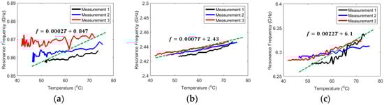 Measurement results of the resonance frequency as a function of temperature for: (a) ESTI band; (b) ISM 2.4 GHz band; (c) ISM 5.9 GHz band.