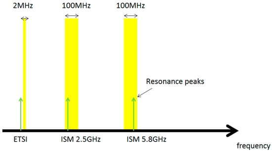 Based on the three resonance frequencies, the proposed compact C-scatterer acts as a three bits encoder for temperature ranges. Logic ‘1’ is represented by a resonance within the band, while logic ‘0’ is represented by a resonance outside the band. The temperature is transduced through the substrate properties into a resonant frequency shift spanning the ETSI and ISM bands. Since these bands do not have the same bandwidth, one expects that the resonance shift will not be the same and hence allow different bit combinations to be assigned to ranges of temperatures. Figure 7 illustrates the principle of temperature threshold encoding.