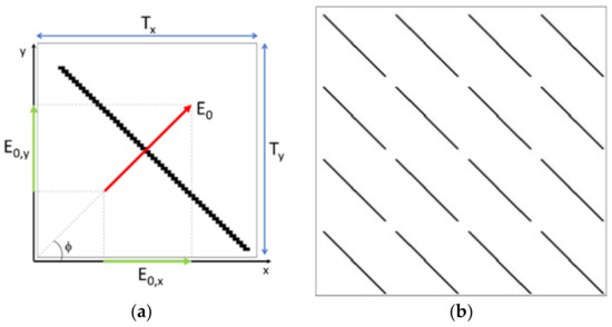 The frequency response of the investigated structure will be calculated using a Periodic Method of Moments (PMoM) [], which considers an infinite periodic surface. The employed PMoM requires the discretization of the unit cell into a M × M pixel matrix, in which each pixel has dimension Tx/M and Ty/M. The adopted discretization for the design, is the one obtained by using M = 64. Let us consider a plane wave that is normally impinging and whose electric field is E0 (Figure 1). It is sufficient to know the 2 × 2 reflection matrix Γ in order to prove the cross polar response of the structure as a function of the phi angle (φ). To explain in more detail, the two components of the reflected field ER along the principal axes can be expressed as: