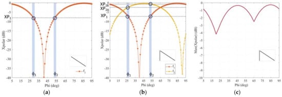 Let us focus the attention on the angular response of the single-dipole unit cell presented in (Figure 1) in correspondence to the frequency f1 = 5.25 GHz, for which the cross-polar reflected field is maximized. For the sake of simplicity, a 90-degree span is considered in this first part of the analysis, but a 180 degree span will be considered for the final performance assessment. Looking at the cross polar response of the single-dipole unit cell (Figure 2a) as a function of φ, it is apparent that there are some cases in which the magnitude of the scattered field is quite low (e.g., around 40 degrees), and above all, that in some cases two different angles exhibit the same cross polar level. For example, φ1 and φ2 both assume a value of XP1, thus causing an ambiguity in the correct estimate of rotation angle φ.