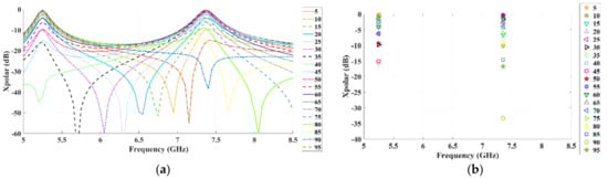 (a) Cross polar of the two-dipole structure at 5-degree steps within a 90-degree span of φ, and (b) the correspondent values for each angular position at f1 and f2.