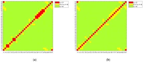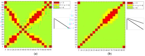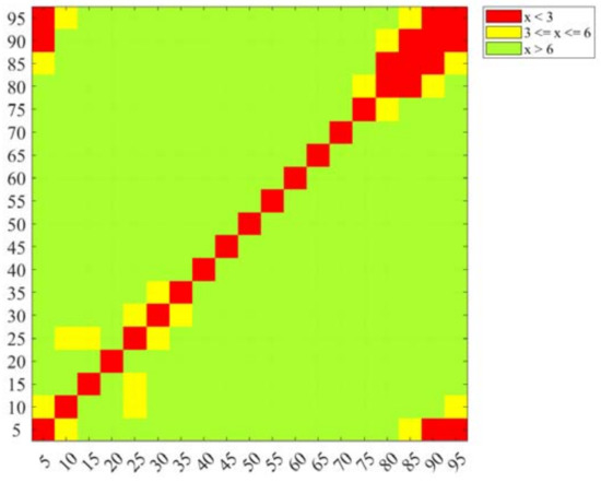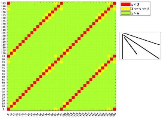 where Xpol(fm, φi) is the codification in terms of cross polar magnitude of the reflected field. Then it is possible to evaluate the distance of a codification with all the others in order to check if any ambiguity is present. Let us fix two thresholds, (thres1 and thres2), and consider two singular angular positions, namely φA and φB. If the value of Dist(φA, φB) is greater than thres1, they are unambiguously encoded. If Dist(φA, φB) is between thres1 and thres2, they are critically encoded. If Dist(φA, φB) is lower than thres2, they are not reliable. This information is clearly represented in the color map of Figure 4a for the case of the two-dipole structure. Each pixel corresponds to the distance between the two referred angular positions. It is well visible that some angle codifications are not univocally defined (such as 60 degrees and 20 degrees), because the distance between their encoding is below the imposed threshold.