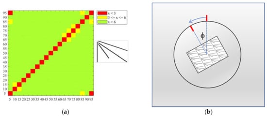 (a) Chart mapping the distance for the four-dipole structure: the three quantized levels of x = Dist(φA, φB) refer to the value assumed by the cross polar at f1 and f2 and by considering thres1 = 6 dB and thres2 = 3 dB. The unit cell is shown in the respective inset; (b) example of application of a 4 × 4 chipless RFID tag with four dipoles applied to a rotating object with a known reference for monitoring the counterclockwise rotation.