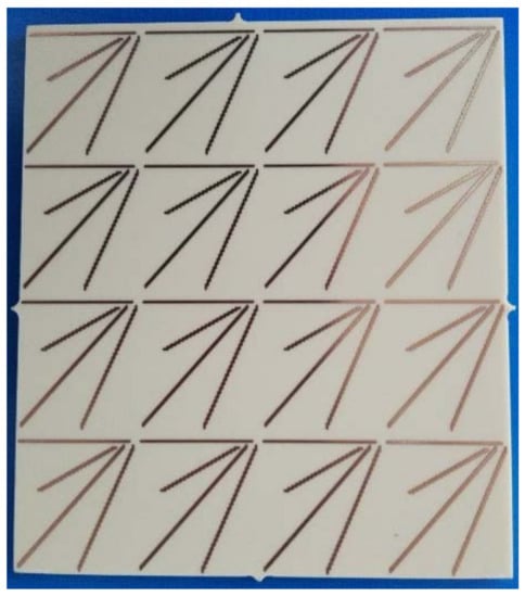 Prototype of the chipless RFID sensor for angular rotation monitoring comprising a set of 4 × 4 unit cells with four-dipole elements in each one.
