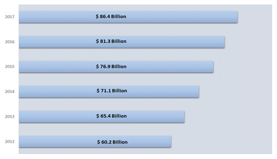 It is estimated that the software development budget to fix security flaws is almost 75% of the total cost after handover of the product to the customer. This is an enormous amount of spending that builds untrustworthiness amongst customers [20]. Figure 1 states the number of yearly spending on Information Technology (IT) security, which shows an escalation of approximately 8% annually [21,22,23].