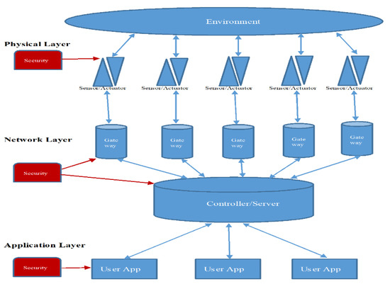 Confidentiality is also a subject of major importance within sensor networks. Networks could be used, in the worst case, to spy on individuals [34]. An example would be the long-term monitoring of persons or vehicles on a routine basis. Another aspect that affects the security of sensor networks are attacks on these networks communication between physical environment and gateway to controller/server, as shown in Figure 2. In the simplest form, the attacker sends a high-energy signal to the sensor to prevent communication within the physical layer to the network layer. This can lead to serious consequences, especially in the case of security-critical CPS. Military applications are also threatened by such attacks. A possibility to combat these attacks lies in the nature of the networks themselves. If a part of the network has been compromised, this part can be demarcated and the communication can be routed around it [33,35]. Therefore, it is of utmost importance to address the security of all components (i.e., physical layer, network layer and application layer) of CPSs.