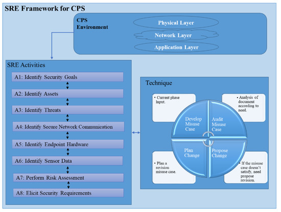 The purpose of Security Requirements Engineering (SRE) framework is to identify security requirements. Meanwhile, there is no comprehensive security requirements engineering framework available for CPSs, since the nature of CPSs is quite different to classical software systems because of the CPS characteristics of heterogeneity and adaptability. Therefore, we propose a security requirements engineering framework that provides ways to determine security requirements throughout the Requirements Engineering (RE) phase, which consists of a number of activities to elicit and finalize the security requirements for CPSs. These activities identify security to avoid potential consequences of attacks for a CPS. The purpose of this framework is to develop early security concepts in the requirements engineering phase. This quest leads to RE methodologies so that security concerns can be addressed during the early stages of software development. The proposed framework is a systematic approach to incorporate security goals, threats, and risk assessment that are critical to the CPS. We have a set of 8 main activities, and one important technique called misuse case as shown in Figure 4. A misuse case is operated like a use case but it is inverse, i.e., a function should not permit the system to operate in a normal condition [62]. This technique is common across all the processes of main activities. Moreover, this CPS framework offers complete guidance to practitioners and researchers to determine security requirements. The framework recognizes the activities that are essential for requirement analysts to follow in order to identify the security requirements for CPS.
