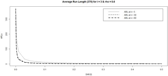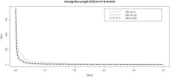 - For all other fixed parameters, the values of ARL decrease as the sample size increases. For example, when , the ARL = 263 for = 5, and ARL = 213 for = 30.
