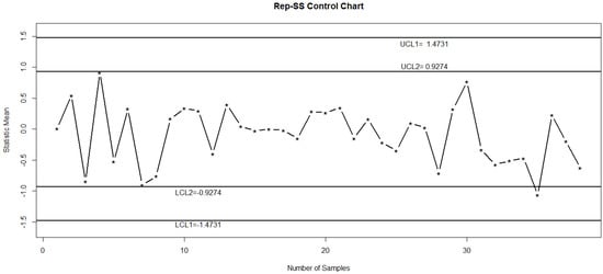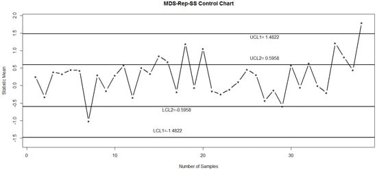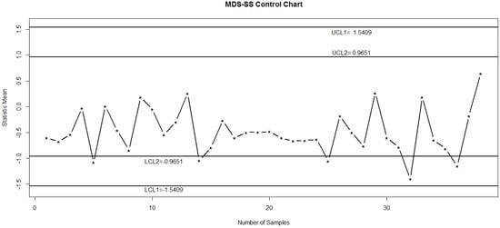 The methodology of developing the proposed control chart using MDS repetitive sampling for process mean monitoring will be further explained via simulation data. In this simulation study, we consider the case of , and . A simulation data have been generated for constructing the control chart using the above mentioned parametric values. First 20 subgroups are generated from the in-control state of the process with mean zero and standard deviation 3, while the next 18 subgroups are generated from an out-of-control process with f = 0.01.