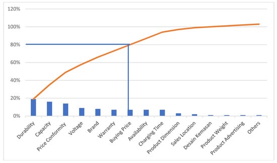 The analysis of market opportunity began with two processes: the first survey that was aimed to discover consumer preference in choosing battery and the second survey that was aimed to predict consumer interest in using lithium battery. In the first survey, the data obtained through Questionnaire 1 were processed using the Pareto method to find the order of indicators that are most considered by consumers. The Pareto chart can be seen in Figure 2.