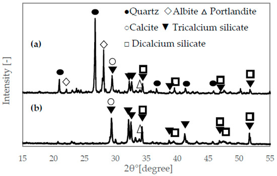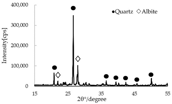 A decrease in the elution concentrations of F, B, As, and Cr was observed with an addition of CSP (Table 1). The elution concentrations of these hazardous ions were 7.15, 8.60, 2.75, and 4.46 mg/L (pH = 8.6), respectively, after the elution experiment. CSP is mainly comprised of components of quartz (SiO2, File No. 01-046-1045) and albite (NaAlSi3O8, File No. 01-001-0739) (Figure 1). Furthermore, it has a high content of SiO2 (52.9%) and Al2O3 (14.4%) (Table 2). In recent years, geopolymer as a type of alkali-activated aluminosilicates, such as calcium aluminosilicate hydrate and alkali aluminosilicate, was reported to immobilize hazardous ions [5,8,42,43]. Albite belongs to a type of sodium aluminosilicate. Geopolymer created from albite would form during the mixing of CSP and water. The forming of the geopolymer would greatly contribute to the immobilization of hazardous ions. The pH values of the filtrates of all the samples were above 12.2 with an addition of OPC. The inhibitory effects of OPC and CSP on the elution of F, B, As, and Cr are illustrated in Table 1.