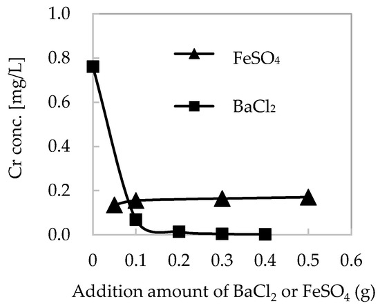 The elution concentrations of Cr with additions of 7.0 g of CSP, 3.0 g of OPC, 0.5 g of Ca(OH)2, 0.4 g of MgCl2, and a certain amount of BaCl2 and FeSO4.