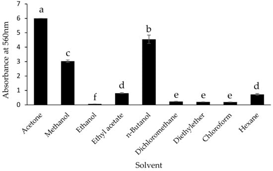 To investigate whether any colour development occurred, due to the extraction solvent in the vanillin—sulphuric acid assay, ten common extraction solvents were tested: Acetonitrile, acetone, methanol, ethanol, ethyl acetate, n-butanol, dichloromethane, diethyl ether, chloroform, and hexane. These solvents were used as absolute. Accordingly, ten reagent blanks and a zeroing blank with water were prepared as described in Table 2. The reagent blanks and the zeroing blank were vortexed, and incubated in a water bath at 60 °C for 15 min, and then cooled down in a water bucket for 5 min. The absorbance of each solution was then measured at 560 nm, using a Cary 50 UV–VIS spectrophotometer (Agilent Technologies, Santa Clara, CA, USA) after the spectrophotometer was zeroed with the water blank (Table 2).