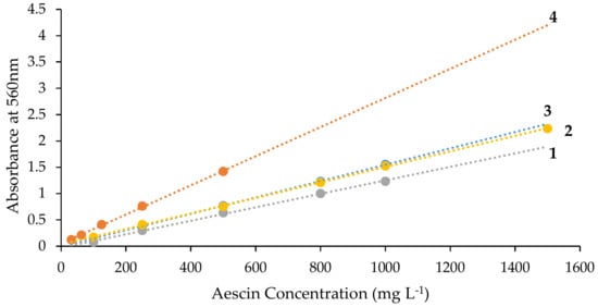 Following the procedure described in Section 2.2.3, four aescin standard curves and their regression equations were obtained as shown in Figure 2. Except for curves 2 and 3, it was observed that the aescin standard curves varied between the solvents used to prepare the aescin solutions.