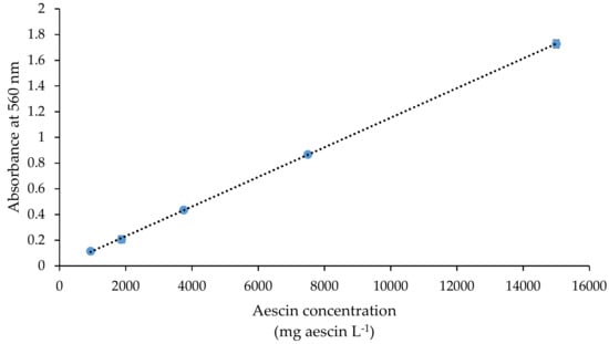 The aescin standard curve and its regression equation, obtained using the modified method described in Section 2.2.4 and Section 2.2.5, is shown in Figure 3. It can be seen that over the concentration range of the aescin standard (937.5 to 15,000 mg L−1), a very highly linear response in absorbance was achieved as the aescin concentration was increased.