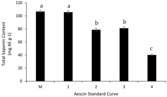 The total saponin content (TSC) of the Gac (Momordica cochinchinensis Spreng) seed kernel powder determined using ethanol as the extraction solvent and the modified method with the aescin standard curve in Figure 3 (M) and the unmodified method with the four aescin standard curves in Figure 2 (1–4). The values are the means of three replicates for each extraction. Columns not sharing the same superscript letter are significantly different at p < 0.05.