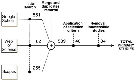 We describe each step of the search and selection process in Figure 2. The search in the three digital libraries resulted in 868 studies. After removing duplicates, 589 studies remained. We applied the inclusion and exclusion criteria to these studies, and obtained 40 primary studies, of which 6 papers were not accessible. The remaining 34 primary studies were used for our research.