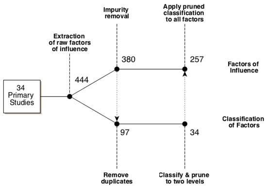 As a consequence of the pruning process to two levels, some studies mentioned a factor more than once. For example, the study including ‘End user computing’ and ‘Networking’ now had two instances of the same class, ‘Use of ICT’. If we remove such duplications and re-apply the pruned classification to all 380 factors of influence found, 257 instances of factors of influence remained in the two-level taxonomy. Figure 3 shows each step we have taken with the factors of influence.