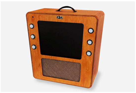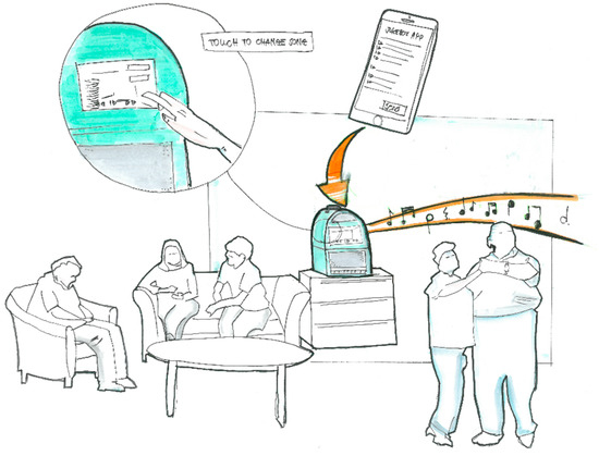 The “Jukebox” combines music from the past with relevant images to target different senses and stimulate memories. Since the prototype can be used just like an actual jukebox (through a limited number of radio buttons for choosing from predefined playlists), it also invites people to interact directly. At the same time, this direct interaction does not demand fine motor skills. All of this meets the described requirements for people with dementia. The general concept of an imagined setting for the “Jukebox” is displayed in Figure 3. The final prototype is shown in Figure 4.