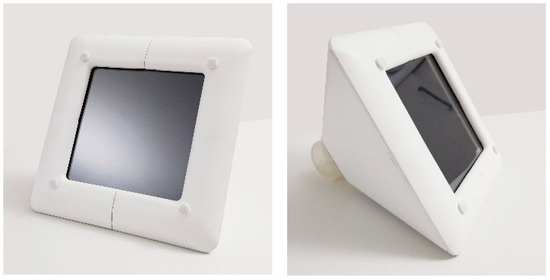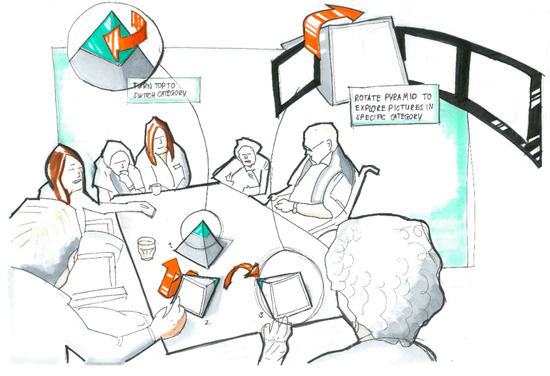 The “Pyramid” combines image material from the most formative and influential spans of time from the lives of participants, with thematically relevant sounds (e.g., true-to-life farm animal sounds, if a farm is shown). Since the prototype can be manipulated by rotating (to change the picture within a topic) and turning the knob on top (to change the topic), this prototype also supports haptic interaction. Simultaneously, it does not demand fine motor skills, which is an important prerequisite for people with dementia. The general concept of an imagined setting for the “Pyramid” is displayed in Figure 5. Images of the actual prototype are depicted in Figure 6.